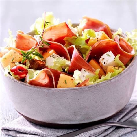 Salade, melon, fromage de brebis et jambon de Bayonne ...