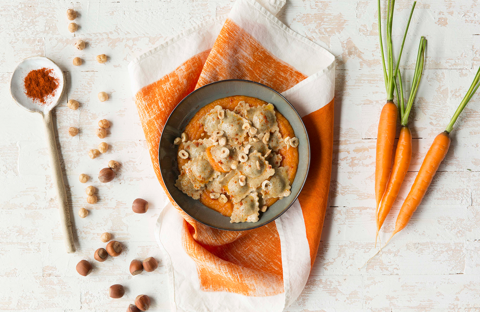 Ravioli Bio de carne ecológica con crema de zanahorias al ...